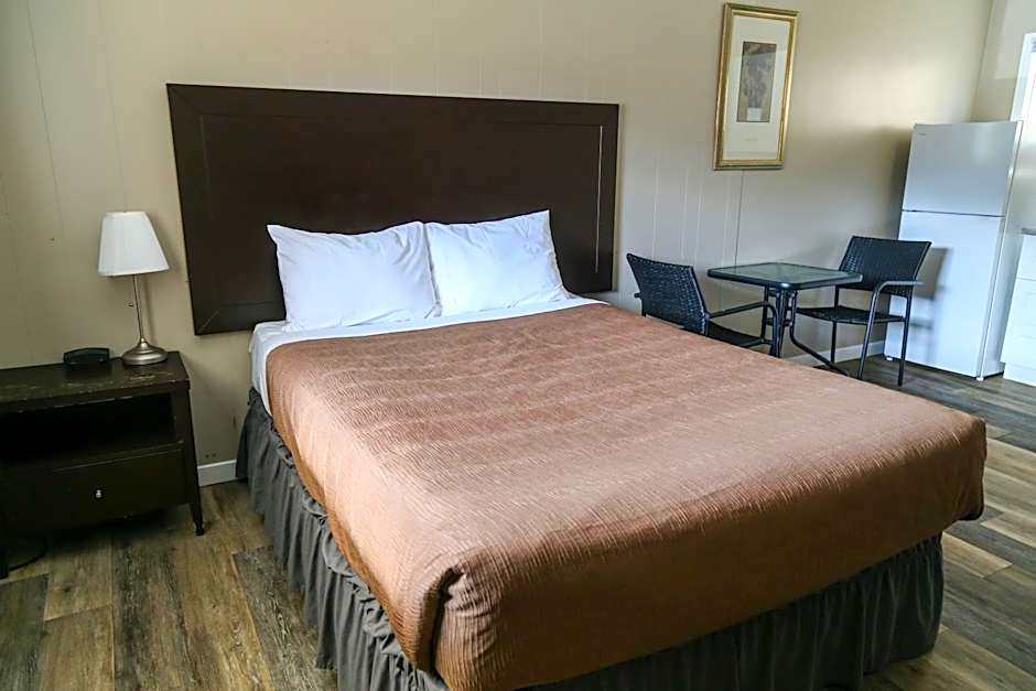 This Queen Studio room has one queen bed, cable TV, Wi-Fi, kitchenette with apartment sized fridge, hot plate, table & chair set, coffee pot, air conditioning and bathroom. Barbecue's are available in the common area located by the office. This suite sleeps 2 maximum.